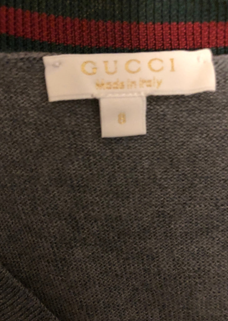 Boys Gucci GG logo grey button up cardigan with red/green collar.