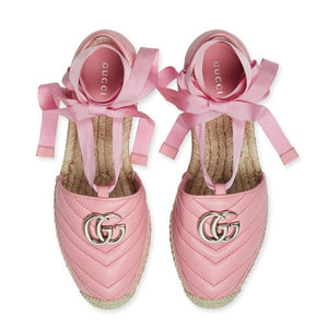Gucci Matelassé ankle-wrap espadrilles. Lace-up the ankles of these matelassé espadrilles from Gucci. Crafted from blush-pink leather with the signature GG logo. Current season, sold out.